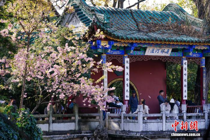 1月5日是小冷骨气,云北昆亮阳黑暗媚,气象恼人,浩繁市平易近战乘客去到翠湖花园,享用冬季“秋乡”的和暖时间。图为花园里开放的冬樱花。中新社记者 刘冉阳 摄