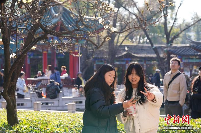 1月5日是小冷骨气,云北昆亮阳黑暗媚,气象恼人,浩繁市平易近战乘客去到翠湖花园,享用冬季“秋乡”的温顺时间。图为搭客正在玉兰花树停摄影。中新社记者 刘冉阳 摄