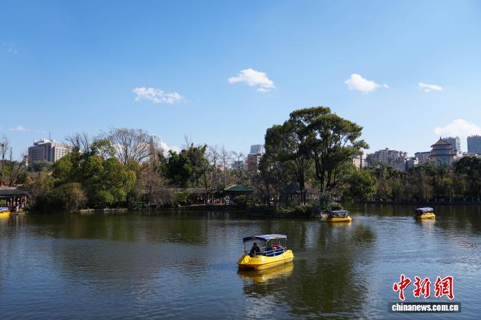 1月5日是小冷骨气,云北昆亮阳黑暗媚,气象恼人,浩繁市平易近战旅客去到翠湖花园,享用冬季“秋乡”的温和时间。图为乘客正在翠湖花园荡舟游历。中新社记者 刘冉阳 摄