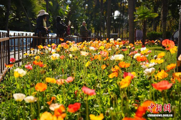 1月5日是小冷骨气,云北昆亮阳黑暗媚,气象恼人,浩繁市平易近战乘客去到翠湖花园,享用冬季“秋乡”的和善时间。图为花园里开放的虞佳人吸收搭客。中新社记者 刘冉阳 摄