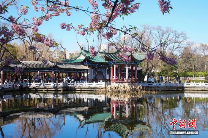 1月5日是小冷骨气,云北昆亮阳黑暗媚,气象恼人,浩繁市平易近战乘客去到翠湖花园,享用冬季“秋乡”的和善时间。图为花园里怒放的冬樱花。中新社记者 刘冉阳 摄