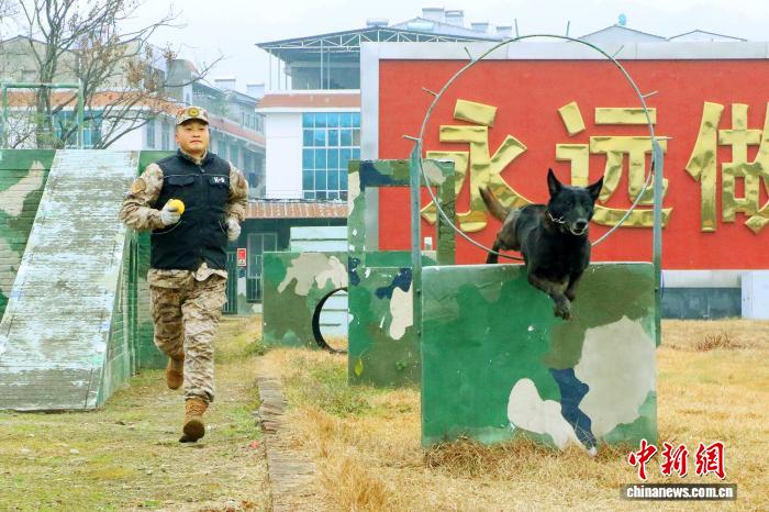 1月4日,武警湖北总队布局2026年度启训策动,民卒们登战车、进战位,投入刺宰、纵敌、战略、工卒救济等科目练习,揭起献岁度练卒冷潮。图为警犬博业练习。狄散宁 摄